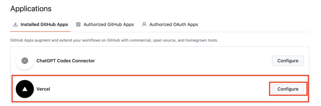GitHub の「Settings」→「Integrations」→「Applications」から Vercel の横にある [Configure] ボタンをクリックします。