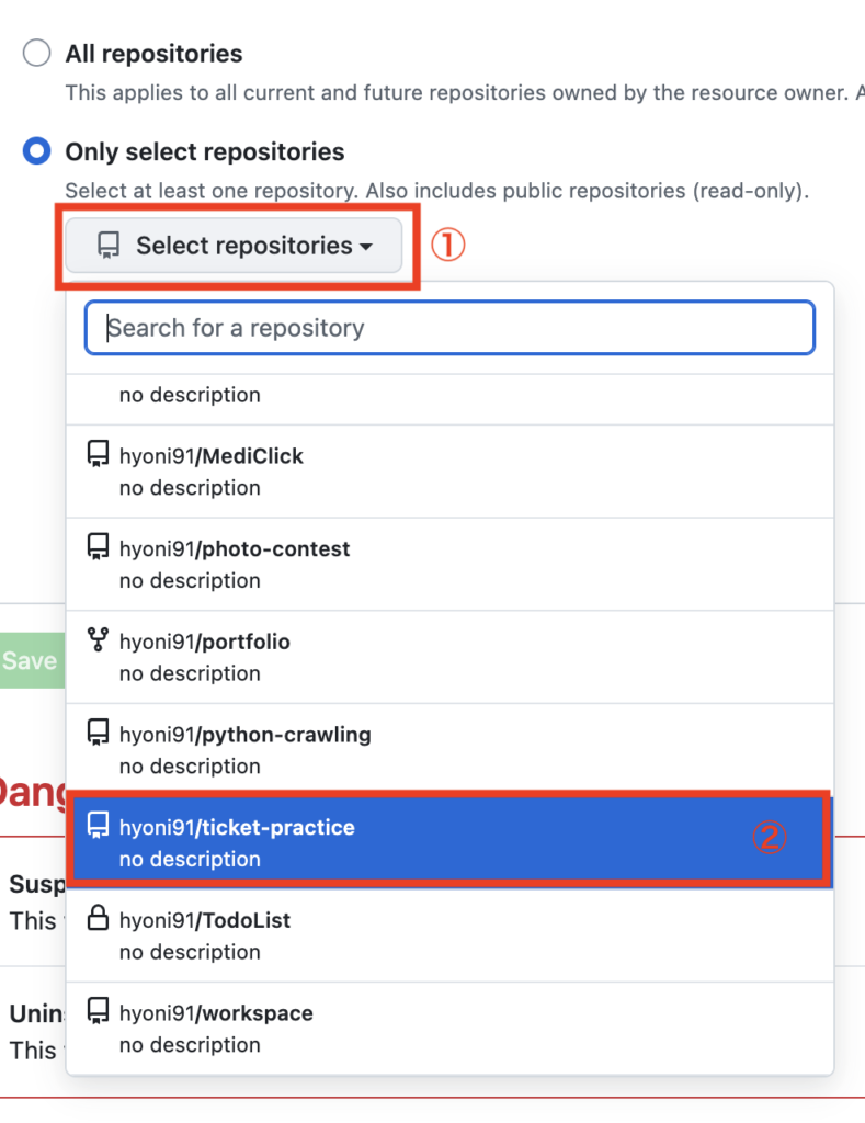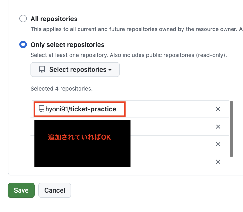 「Repository access」の「Only select repositories」から、今回デプロイしたいリポジトリを選択して保存します。