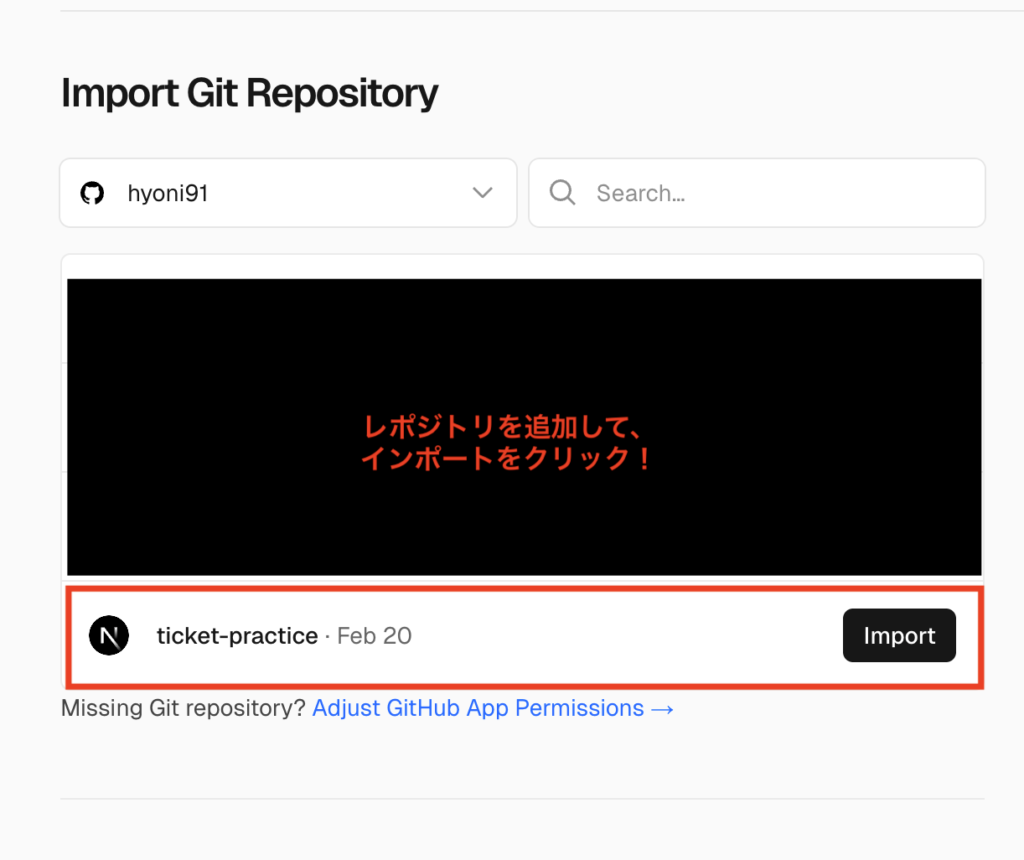 もし Vercel の設定で「Selected repositories」を選択している場合、新しく作成したリポジトリを Vercel が認識できるように GitHub 側で許可 を出す必要があります。ここを忘れると Vercel 上にリポジトリが表示されないので注意しましょう!