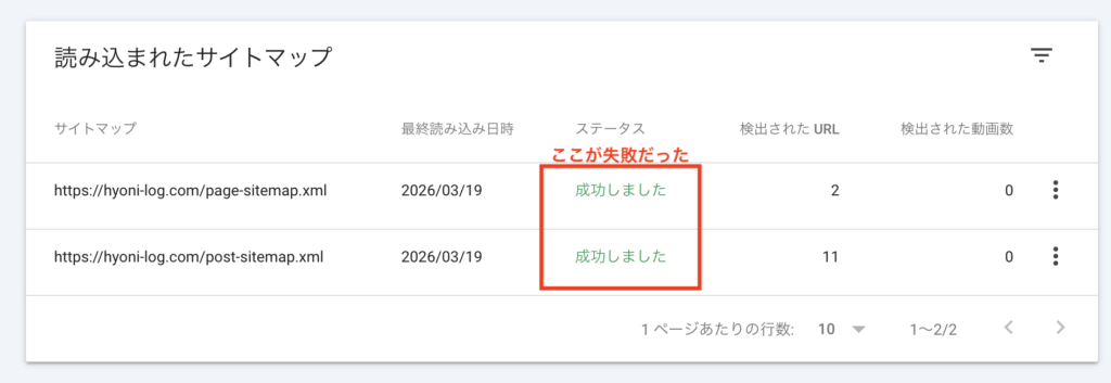 一見、サイトマップは正常に登録できているように見えますが、実際には内部で失敗している状態でした。