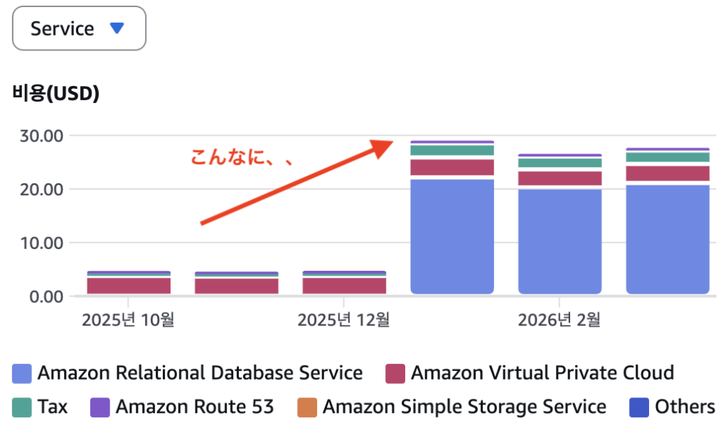 以前、MariaDBを使って作った「韓国書籍情報のホームページ」を、AWSのフリーティアで運用していました。そのときの月額料金はだいたい4ドル前後。特に問題もなく、しばらく放置していました。ところがある日、「MariaDBのバージョンをアップデートしてください」という通知が来たのをきっかけに、久しぶりにAWSにログインしてみると…1月・2月の請求がそれぞれ約27ドルに増加していました。