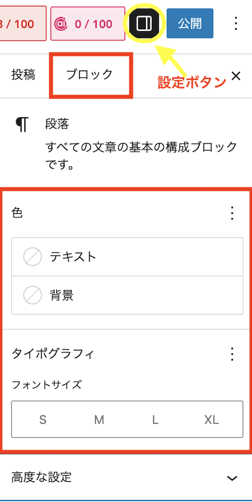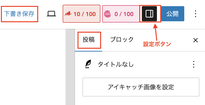 記事作成画面の右側には「設定パネル」があります。